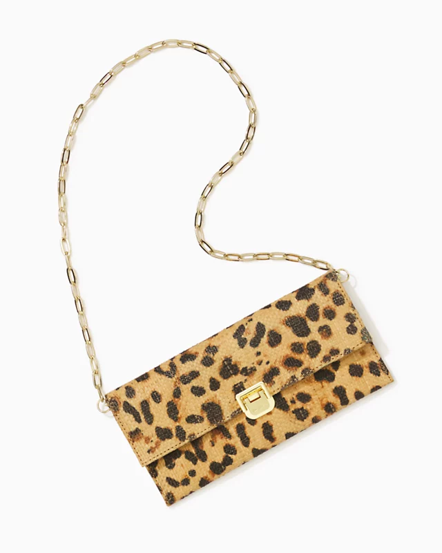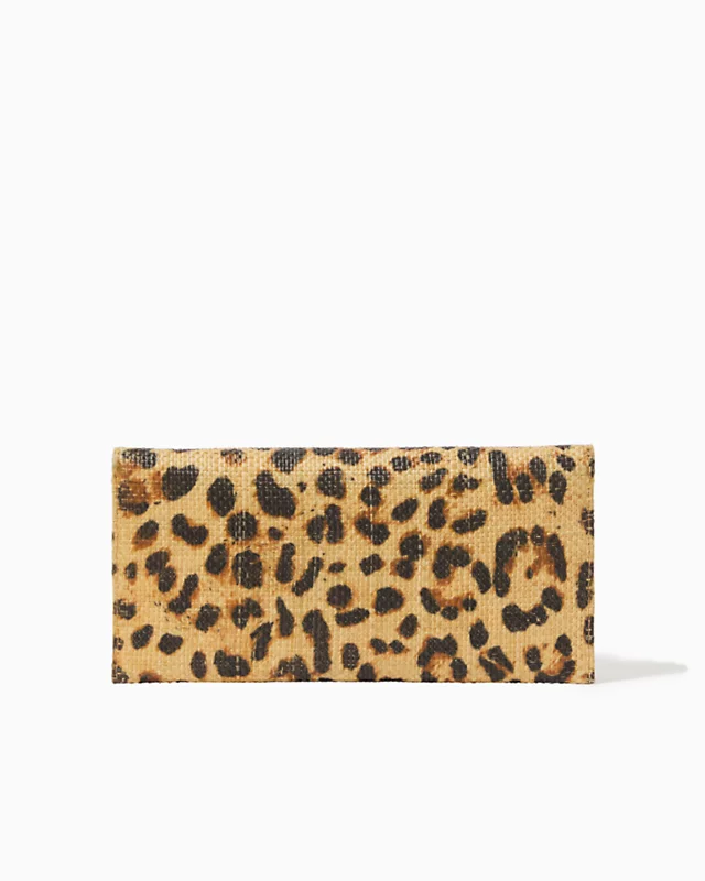 Take a walk on the wild side with our Abbot Leopard Clutch, a sleek printed straw design accented by a gold hardware closure and detachable paperclip chain strap.