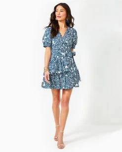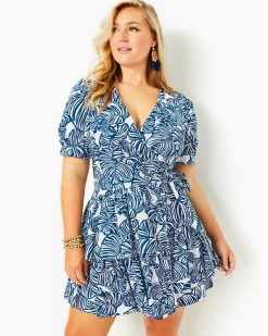 The Alexandria Dress is a social standout in crisp cotton poplin. This classic wrap style with a surplice neckline, tie waist, and pleated elbow-length sleeves also includes tiers that add playful movement to its above-the-knee skirt.