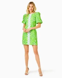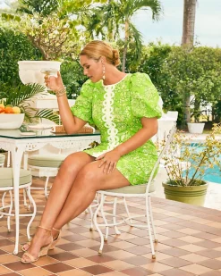 Lilly’s heritage shines bright in this classic shift, a straight fit style in vividly printed stretch poplin. The Alyce Shift features bubble hem puff sleeves and intricate Lilly lace trim.