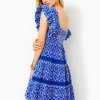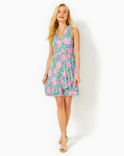 A skirt trimmed in ruffles adds romantic movement to our printed jersey Annalise Dress, a fit-and-flare style with a V-neckline and ruched waistband.