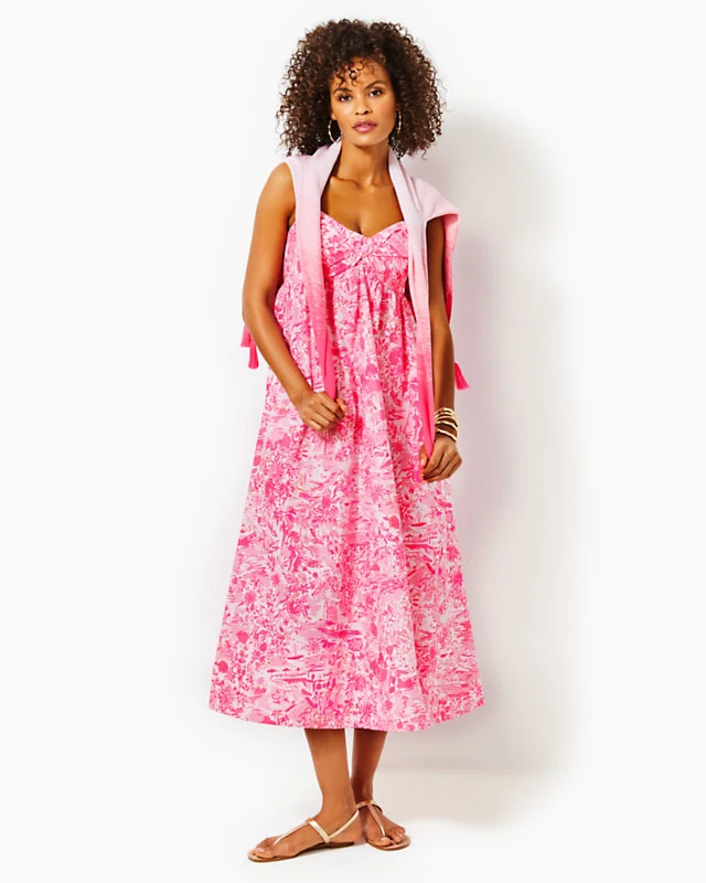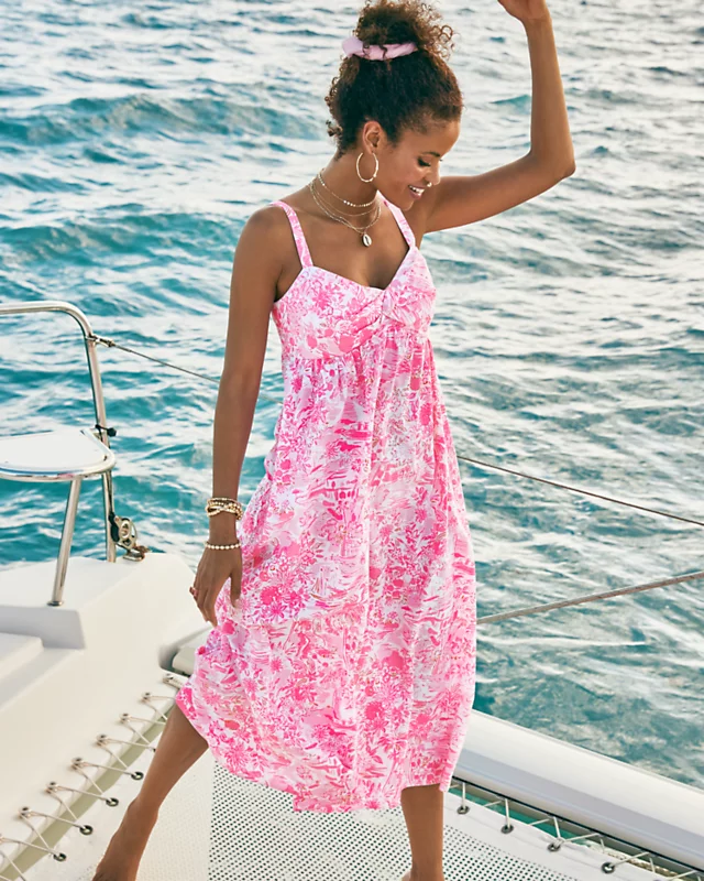 Breeze through summer in the perfect midi sundress, made from lightweight cotton poplin in a spirited print. The Azora Dress is a fit-and-flare style with wide adjustable straps, a twist-front bodice, side seam pockets, and a smocked back panel for a comfy fit.