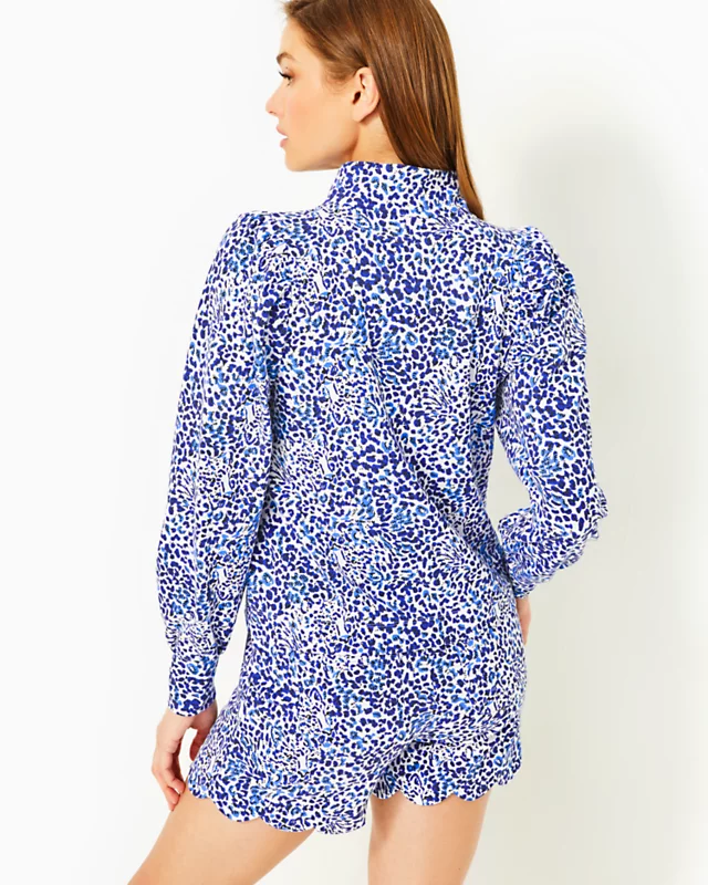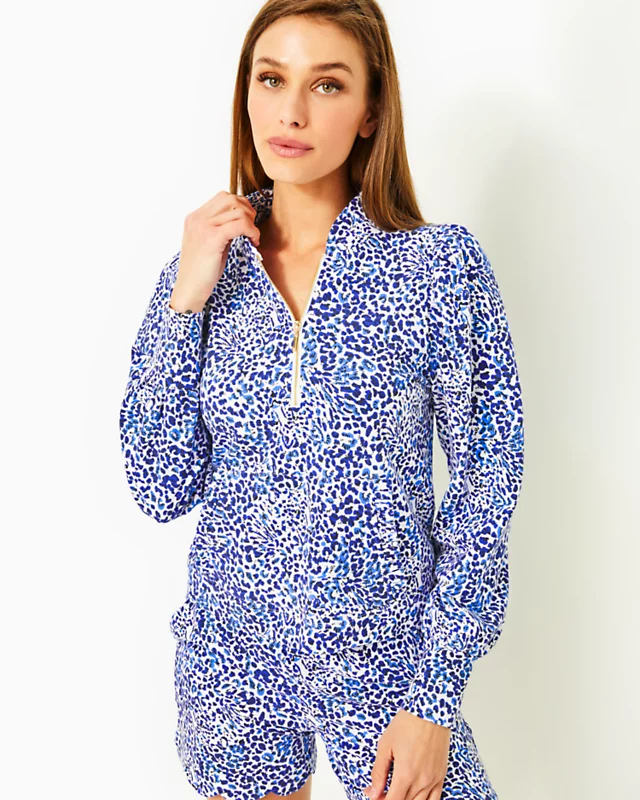 Soft and effortless in Luxe Terry, Cabello is the season’s prettiest popover. This straight fit style features a half-zip neckline, ruffled front pocket, stand-up collar, and full sleeves with shirred details. Lilly logo hardware makes a chic finishing touch.