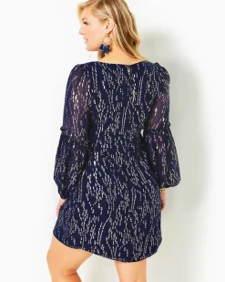 Effortless style meets party-ready glamour in the Cleme Dress. Dusted with metallic details, this silk chiffon dress offers an easy silhouette with full sleeves and a V-neckline trimmed in ruffles and pintucks.