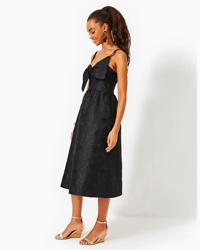 Textural jacquard and a dramatic bow detail at the bodice make the Ellara Dress our most elegant special occasion look. This fit-and-flare midi features a strappy sweetheart bodice, a smocked back, and side seam pockets.
