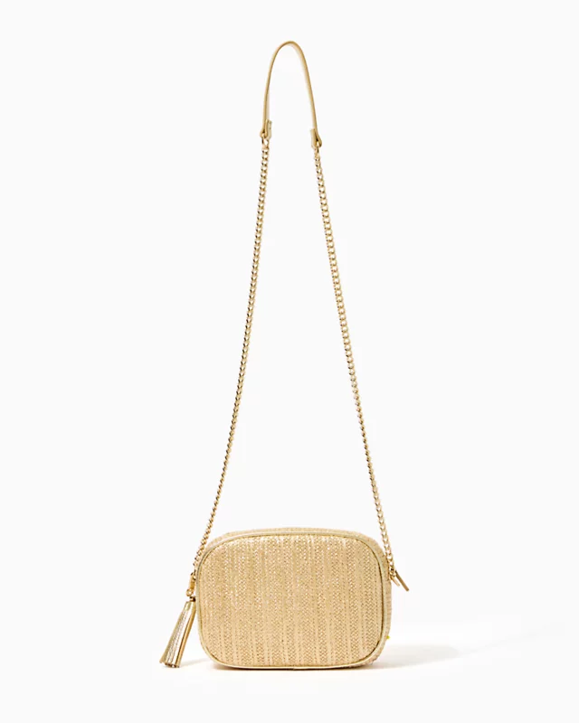 Woven from metallic straw and topped with a gold chain crossbody strap, the Ellis Crossbody is an essential warm weather accessory. A fringed tassel charm completes the look.
