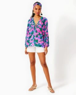 A tried-and-true wardrobe staple, our Elsa Silk Top can be dressed up or down. The Elsa has become a Lilly favorite thanks to its loose-fitting body, beautifully smocked neckline, and signature gold buttons at the placket. Pair with jeans, leggings, shorts, or a skirt to make this elegant pullover top your own.