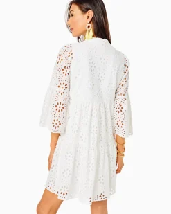Delicately detailed in Funflower Eyelet fabric, the Hazelanne Dress is a swingy, button-front style. A tiered skirt and ruffle hem sleeves add feminine detail and movement to this spring social standout.