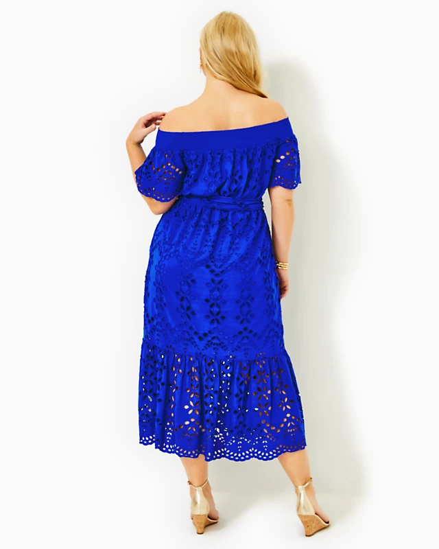 Daintily detailed eyelet adds beautiful texture to our Isbell Dress, an easy midi design with an off-the-shoulder neckline, ruffled hem, and side seam pockets.
