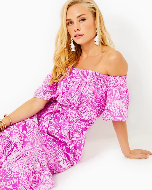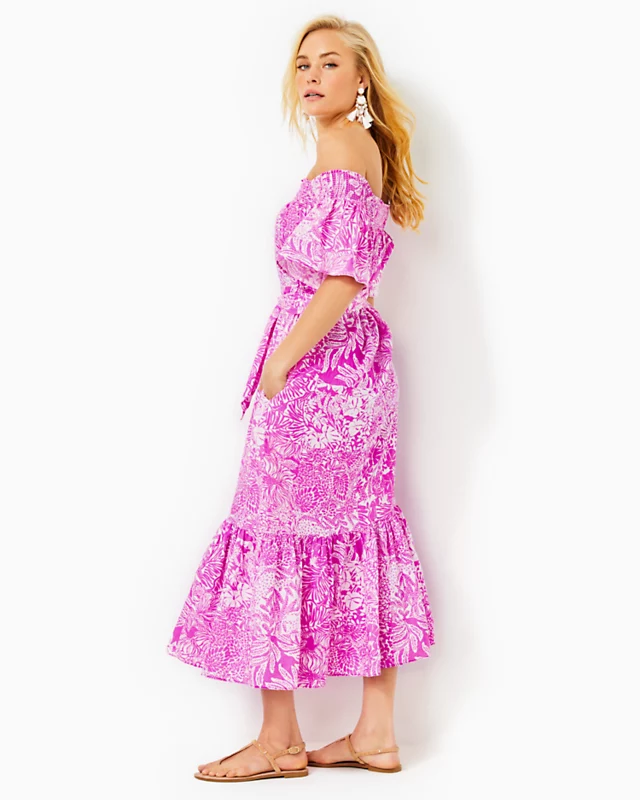 - Easy fit, off-the-shoulder midi dress with skirt hem ruffle and side seam pockets.
