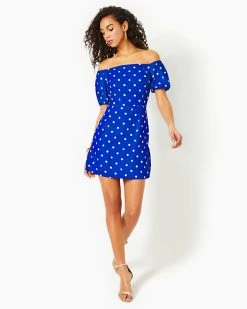 - Off-the-shoulder shift romper with balloon sleeves, side slits, and removeable sash.