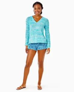 An easy fit and soft cotton slub fabric will make the Jody Sweater your new favorite layering piece. A V-neckline, side slits, and a step hem trimmed in tassels complete this long sleeve look.