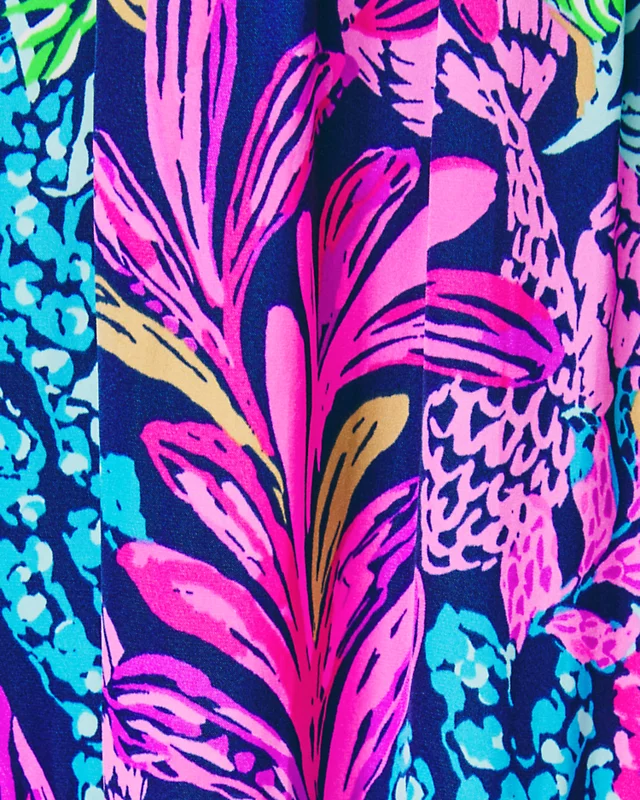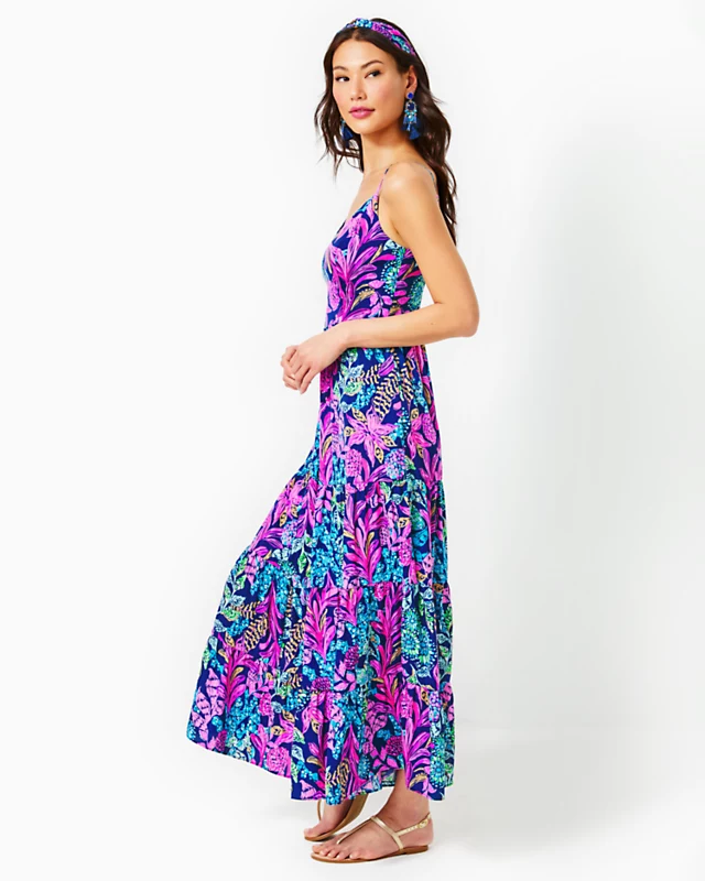 Graceful and flowy, the printed satin Joellane Dress is a fit-and-flare maxi with adjustable spaghetti straps, a smocked back, and a tiered skirt with side seam pockets.