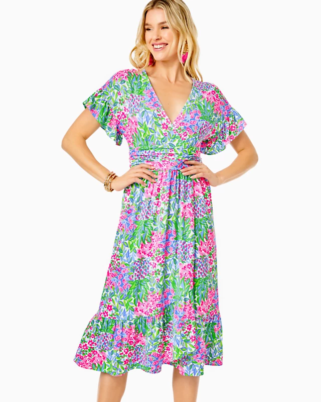 Soft and breezy in printed jersey, the Juliet Midi Dress features a timeless fit-and-flare silhouette with a surplice neckline and wrap front skirt. Ruffled kimono sleeves and a matching hem give this style its feminine flair.