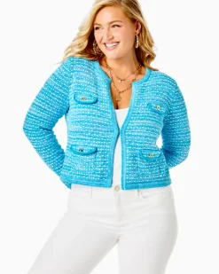 A classic sweater silhouette gets a modern Lilly makeover with our Kienna Cardigan. Featuring an open-front design with a hook-and-eye closure, this sweater jacket shines bright in our signature custom colors. Four patch pockets accented with gold buttons complete the look.