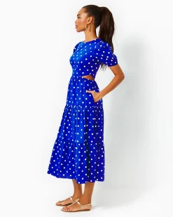 - Fit-and-flare, midi dress with short, full sleeves, waist cut-out detail, tiered skirt, and pockets.