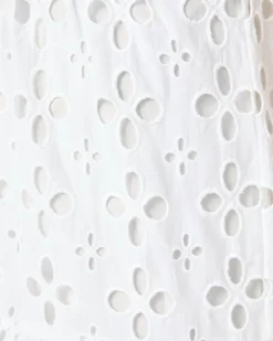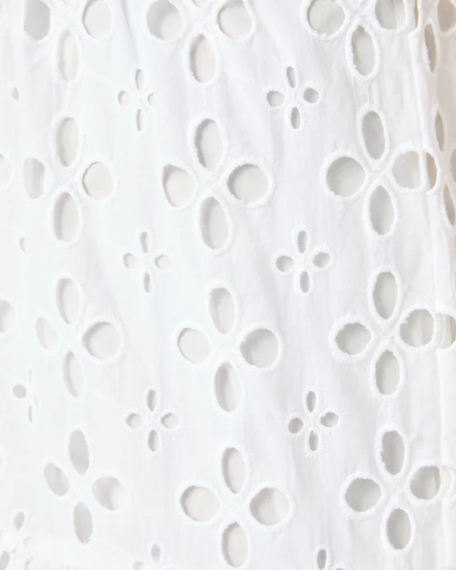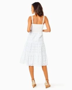 A sweetheart neckline tops off our delightfully detailed Majorie Eyelet Dress. This quintessential sundress features slender straps, a tiered knee-length skirt, a smocked back panel for a fabulous fit, and Lilly lace trim at the waist.