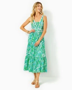 - Fit-and-flare midi dress with tiered skirt, side seam pockets, back smocking panel and ric rac trim.