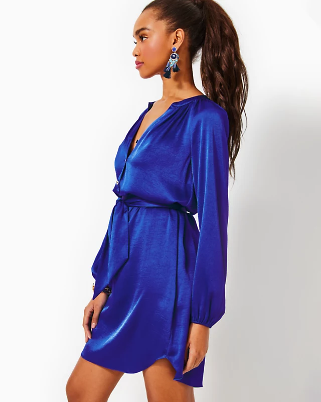Elegant and flowy in richly colored satin, the Saige Dress is a timeless design. This popover shirtdress features a half-placket with gold buttons, long sleeves, and a separate sash at the waist.