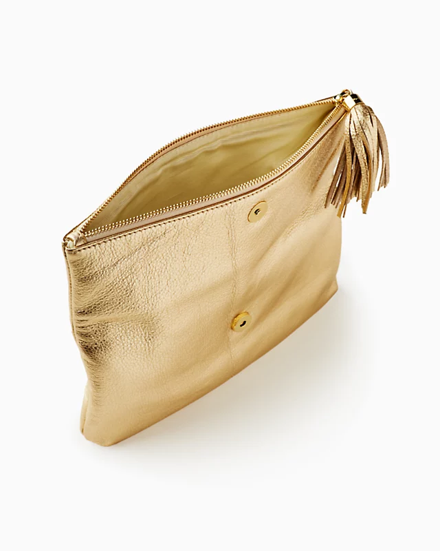 Go from day to night in effortless style with the Seaside Clutch, a minimalist design in gold shrunken leather with a tassel detail.