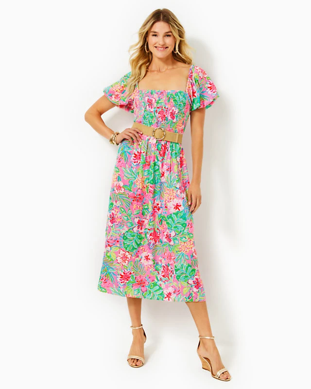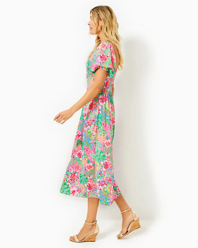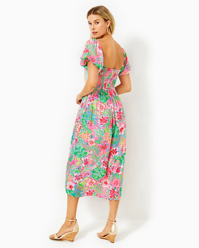 Elegant and flowy in printed satin, the Selah Midi Dress is a sophisticated social look. An easy fit, smocked bodice, and short puff sleeves round out this summertime stunner.