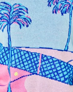 Bring colorfully chic style to the tennis court in the Vivie Sweater, a vibrant design in soft combed cotton. This graphic intarsia crewneck features short puff sleeves with pleated details and metallic striped trim.